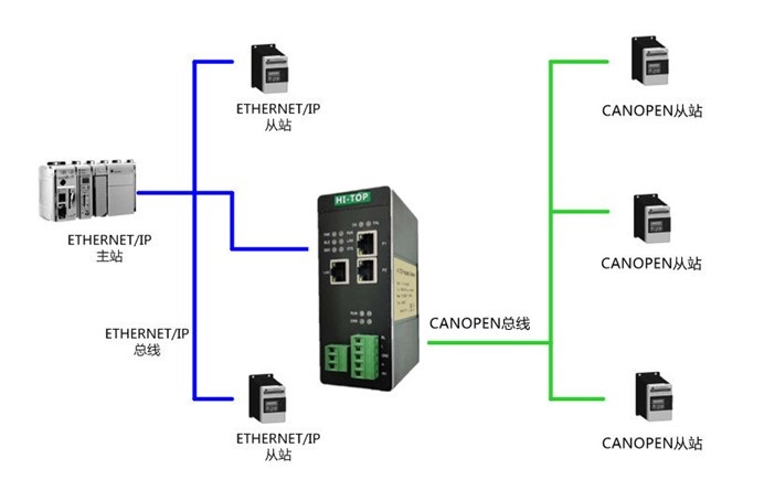 CANopen 設備接入到 EtherNET/IP 網絡中。本網關連接到 EtherNET/IP 總線中作為從站使