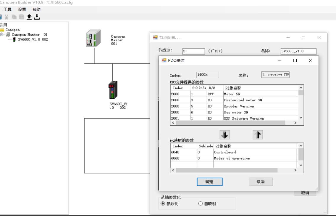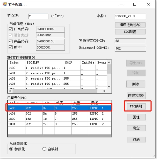 (1)雙擊從站的圖標,配置該從站的參數。選中 RXPDO(1400),點擊“PDO 映射”按