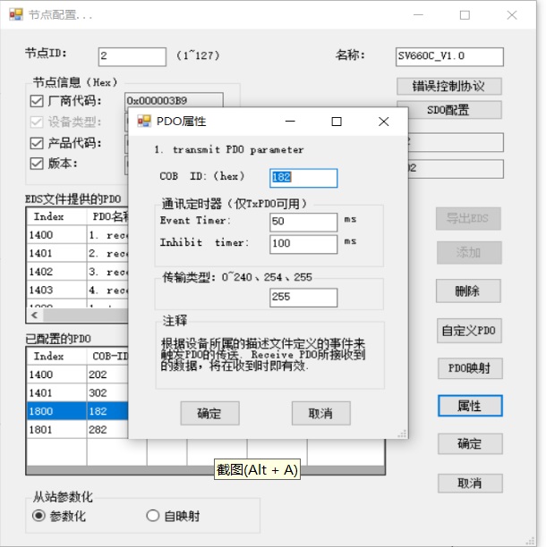 輸入 TXPDO 定時發送時間,例如 100ms,、50ms、傳輸類型 255,點確定。