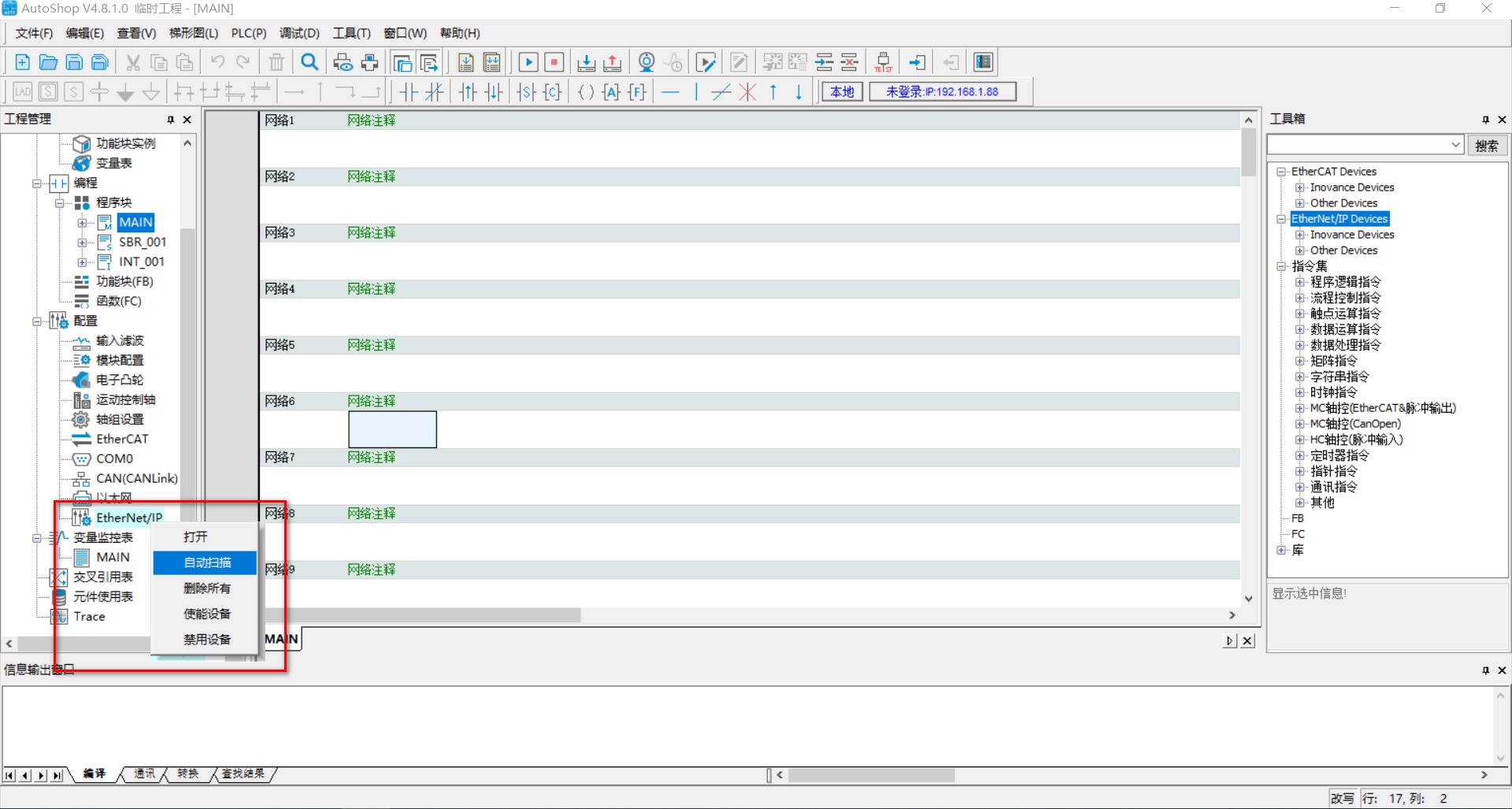 (3) 重啟后在打開的界面右擊 項目樹中的 ETHERNET/IP,進行掃描設備并添加: