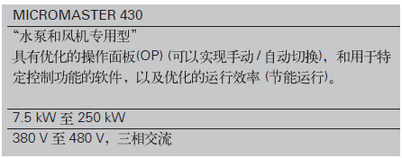 ----MicroMaster430是全新一代標準變頻器中的風機和泵類變轉矩負載專家。功率范圍7.5kW至250kW。它按照專用要求設計,并使用內部功能互聯(BiCo)技術,具有高度可靠性和靈活性。控制軟件可以實現專用功能:多泵切換、手動/自動切換、旁路功能、斷帶及缺水檢測、節能運行方式等。