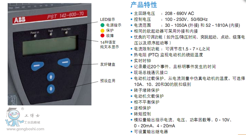 PSS44/76-500L,ABB軟起動器通用型PSS系列,適用于常規起動,脫扣級別10,外接,主回路電源電壓范圍為208-690VAC,主回路工作電壓為500VAC,400V下的額定功率是22KW,額定電流44A,環境溫度40°C,額定控制電壓220-240VAC,50/60Hz。