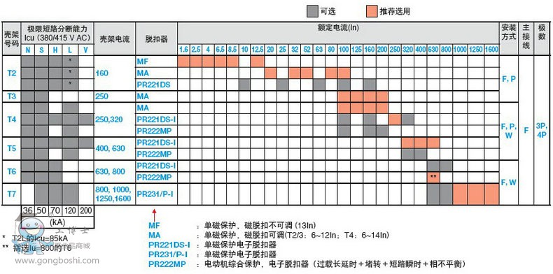 全部3極和4極斷路器均有固定式;其中,T2、T3、T4和T5還具有插入式,而T4、T5、T6和T7更具有抽出式。