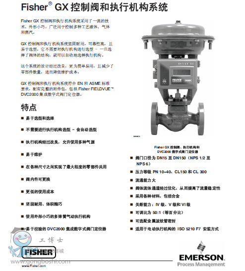 數字閥控制器。GX 產品配備 DVC2000 數字閥控制器。DVC2000 使用簡單、尺寸緊湊并且安裝方便。它將 4-20 mA 輸入信號轉換為氣動輸出信號,供給控制閥執行機構。儀表設置通過一個按鈕和液晶顯示器 (LCD) 界面進行。此界面封裝在密封機箱內,和環境隔開。界面支持多種語言,包括德語、法語、意大利語、西班牙語、中文、日文、葡萄牙語、俄語、波蘭語、捷克語、阿拉伯語和英語。