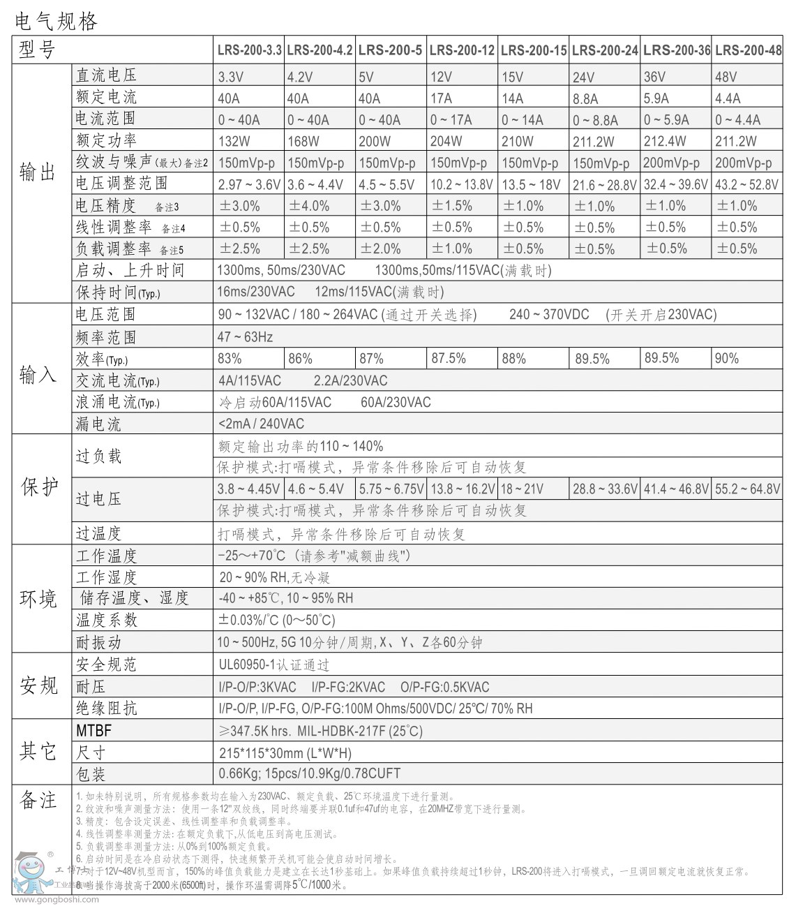 直流電壓3.3V|4.2V|5V|12V|15V|24V|36V|48V 額定電流40A|40A|40A|17A|14A|8.8A|5.9A|4.4A