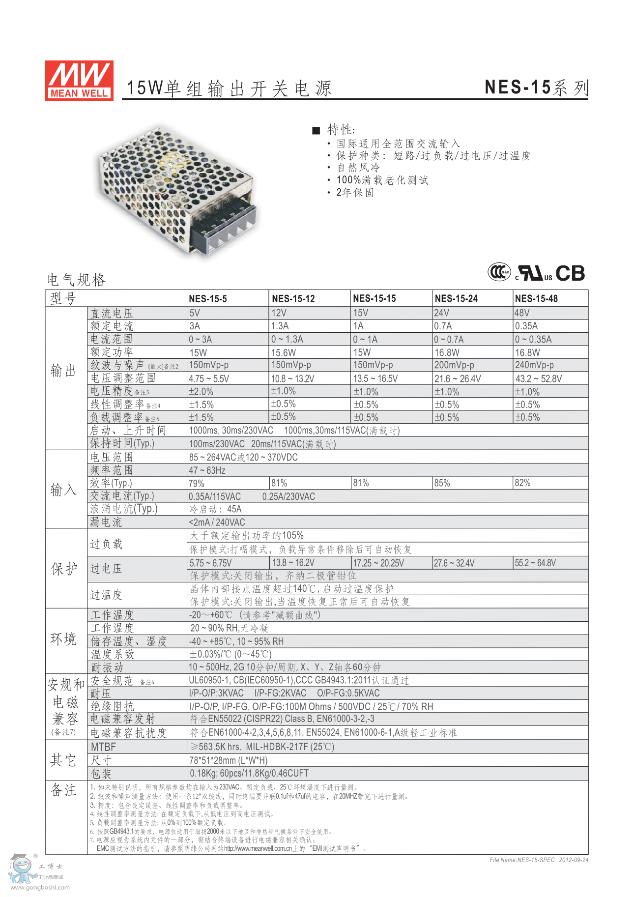 明緯開關電源NES-15-48 48V0.35A
