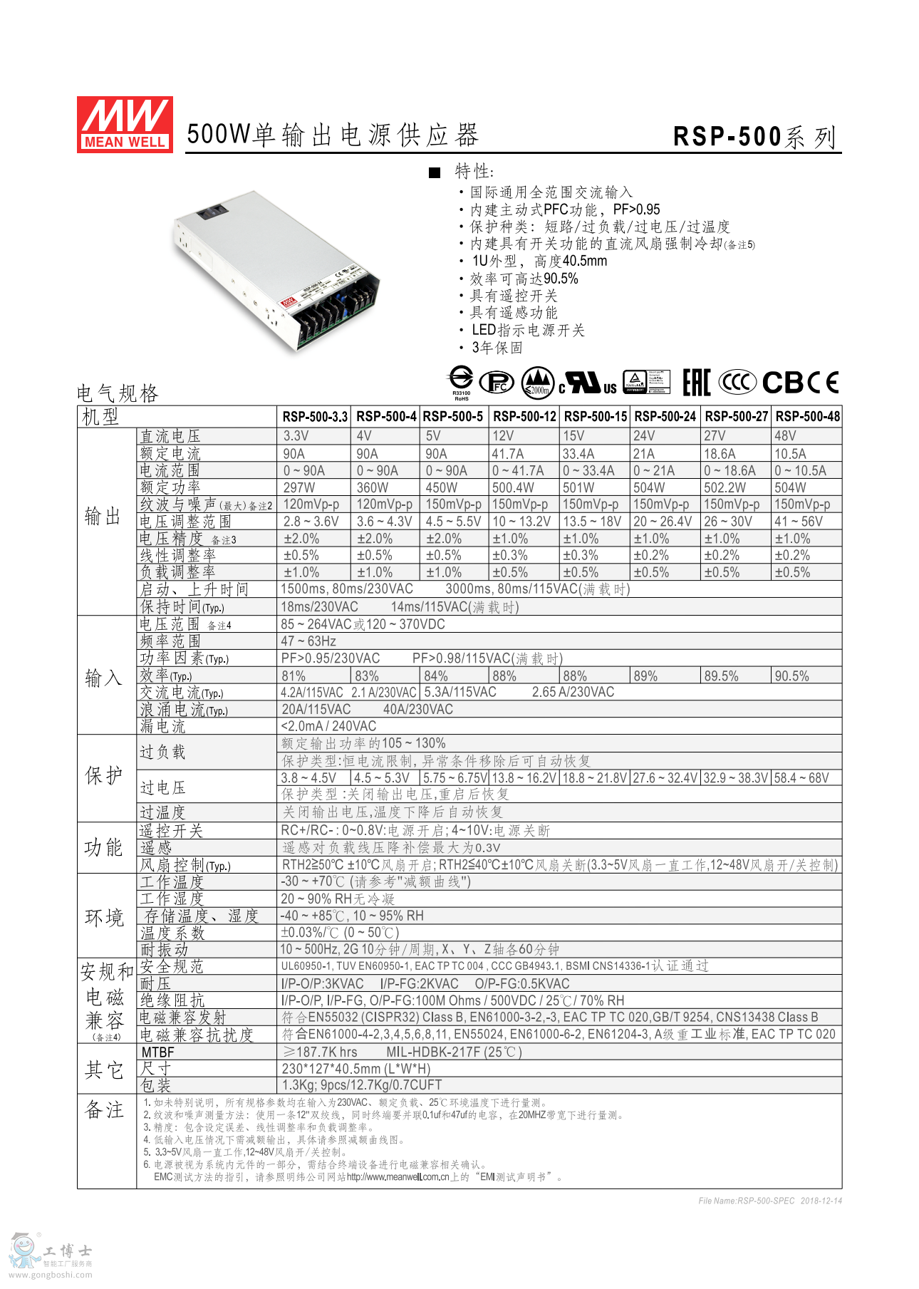 1U 低高度設計—75W~320W: 30 mm, 500W: 40.5 mm