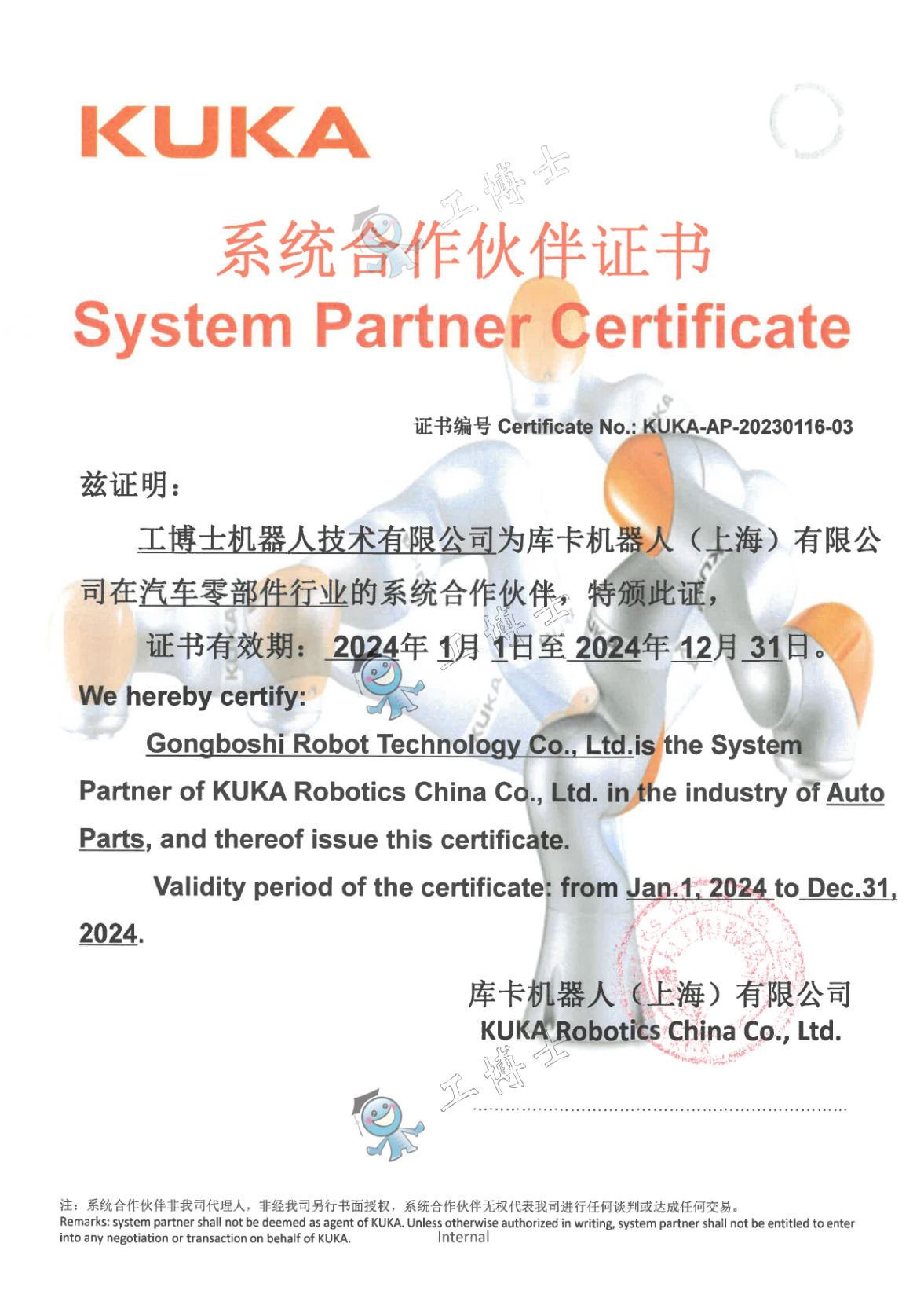 機(jī)器人授權(quán)證書-2024KUKA系統(tǒng)合作伙伴—工博士(水印)