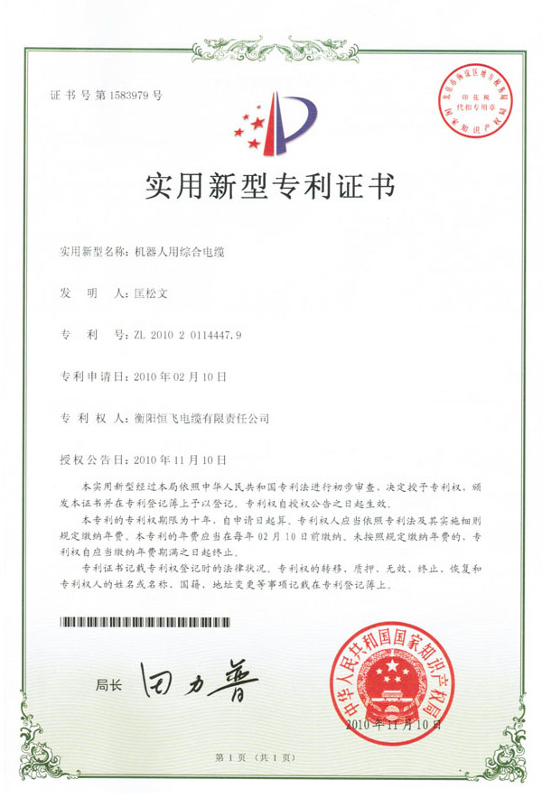 衡陽(yáng)恒飛電纜有限公司獲取各項(xiàng)專利證書