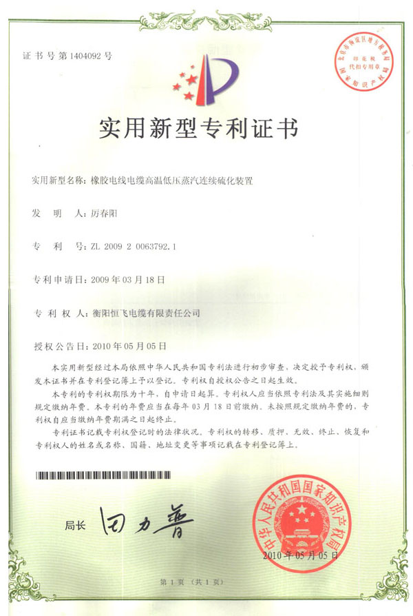 衡陽恒飛電纜有限公司獲取各項專利證書。