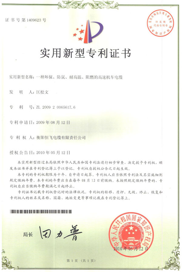衡陽恒飛電纜有限公司獲取各項專利證書