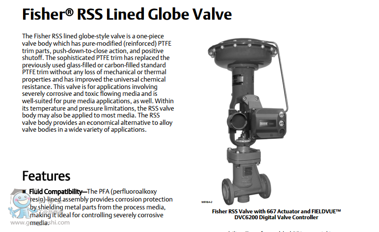Fisher® RSS 襯里直通閥具備PTFE 閥內件部件,下推關斷動作功能以及絕對關斷性能,PTFE 波紋管密封件。尺寸 NPS1/2 到4,壓力等級CL150或300。