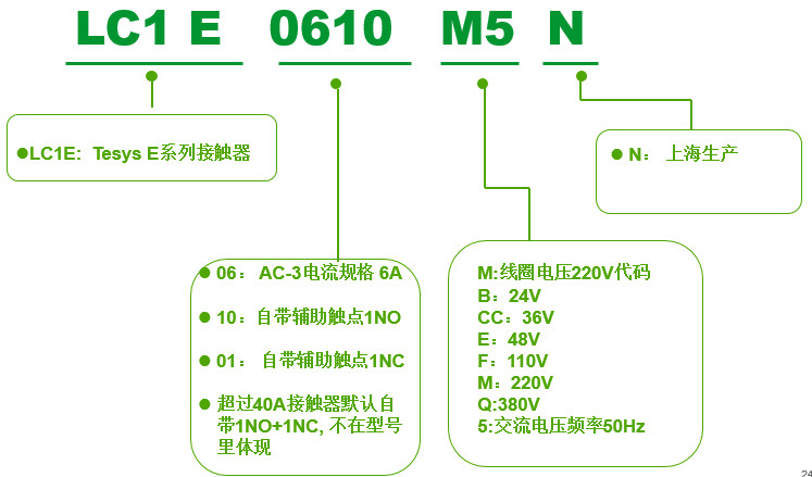 交流控制電路,夾持安裝 性能描述: AC-3/ 6-95A簡單應用 防護等級IP20 工作溫度-25°C to +70°C 產(chǎn)品認證CCC, RoHS、EE、REACH 1200百萬次電氣壽命 優(yōu)勢:規(guī)格擴展至95A,安全可靠,環(huán)保低能耗線圈,全面符合RoHS要求。Tesys E 全系列接觸器增加了線圈電壓頻率為60HZ 的產(chǎn)品,豐富了接觸器產(chǎn)品系列,滿足了客戶的出口需求。 應用范圍:各類型OEM客戶;紡機、塑機、空壓機等原始設備制造商;小型盤廠,小規(guī)格路燈照明控制箱。