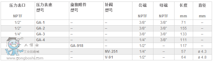 GA, NV, V-系列,壓力表附件