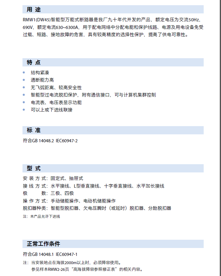 RMW1系列智能型萬能式斷路器(以下簡稱斷路器),該斷路器適用于交流50Hz,額定電壓400V、690V,額定電流6300A及以下的配電網絡中,用來分配電能和保護線路,防止電源設備遭受過載、欠電壓、短路、單相接地等故障的危害。斷路器具有智能化保護功能,選擇性保護范圍廣而精確,能提高供電可靠性。