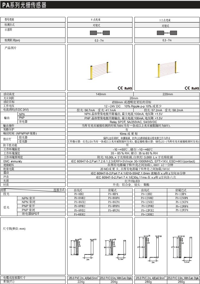 8/12點(diǎn)光束 0.3-7M 屏蔽 鋁合金,聚酯 標(biāo)準(zhǔn)型 漫反射、鏡片反射、對(duì)射 PA系列光柵傳感器