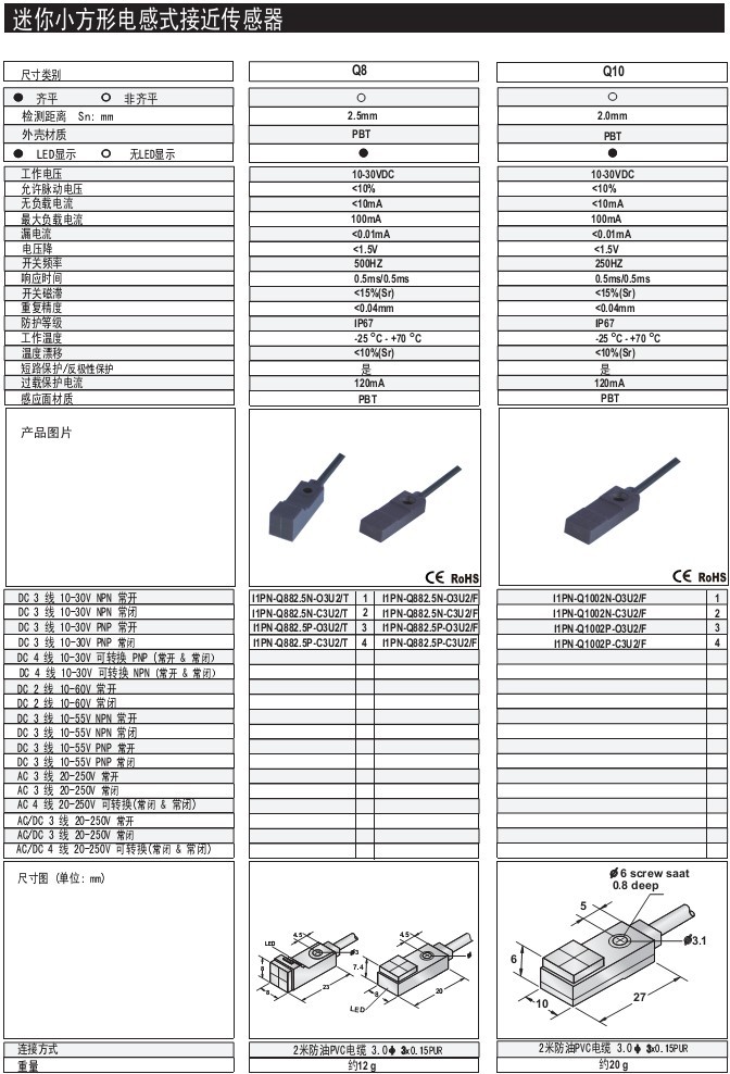 Q8 2.5mm 齊平/非齊平 PBT 標準型 出線式 迷你小方形接近傳感器