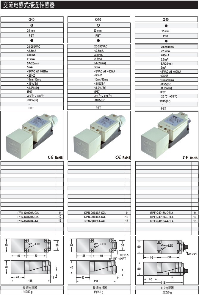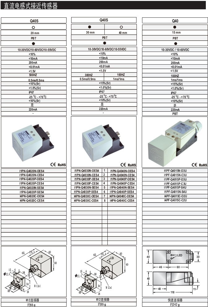 Q40 20mm 齊平/非齊平 PBT 標準型 M12連接器 直流電感式接近傳感器