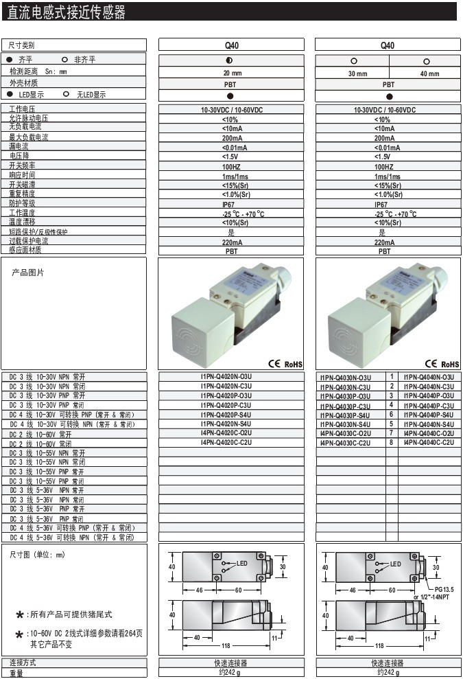Q40 20mm 齊平/非齊平 PBT 標準型 連接器 直流電感式接近傳感器
