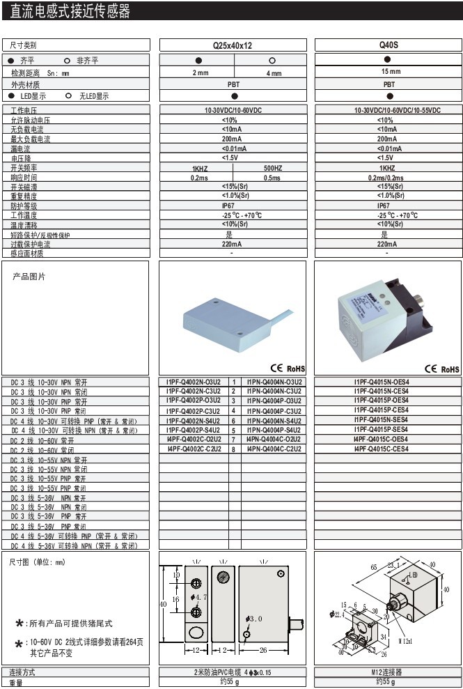 Q40S 40mm 齊平/非齊平 PBT 標準型 M12連接器 直流電感式接近傳感器