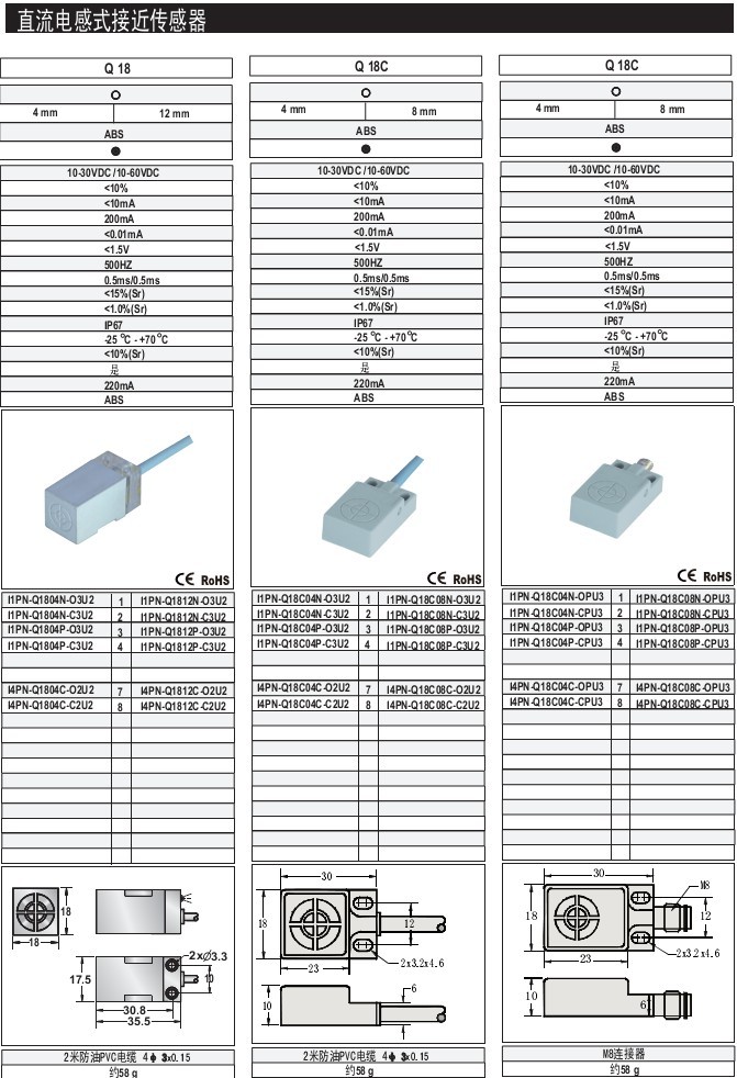 Q18c 8mm 齊平/非齊平 ABS 標準型 出線式 直流電感式接近傳感器