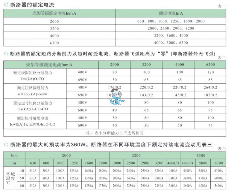 智能型萬能式斷路器(一下簡稱斷路器),適用于交流50HZ,額定電壓至660V(690V)及以下,額定電流630A~6300A的配電網(wǎng)絡(luò)中,用來分配電能和保護(hù)線路及電源設(shè)備免受過載、欠電壓、短路、單相接地等故障的危害。斷路器具有智能化保護(hù)功能,選擇性保護(hù)精確,能提高供電可靠性,避免不必要的停電。同時帶有開放式通訊接口,可進(jìn)行“四遙”,以滿足控制中心和自動化系統(tǒng)的要求。斷路器在海拔2000米時脈沖耐壓8000V(不同海拔按標(biāo)準(zhǔn)修正,*高不超過12000V)。該斷路器不帶智能控制器及傳感器可作隔離器用,