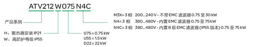 ATV212系列變頻器對應的電機額定功率范圍是0.75 kW至75 kW,電源采用以下類型: