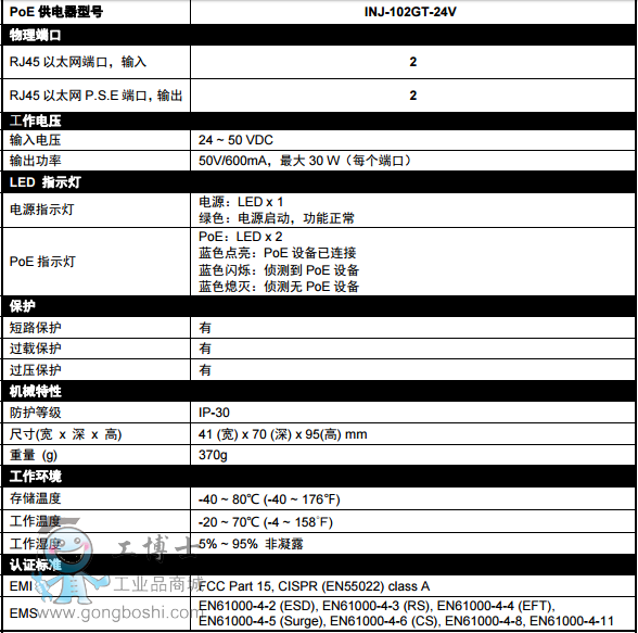 INJ-102GT-24V PoE供電器不僅符合IEEE802.3at標(biāo)準(zhǔn),還是一款能夠提供高功率的PoE供電器。它提供2個(gè)10/100 1000Base-T(X) PoE端口,支持智能檢測(cè),只有當(dāng)檢測(cè)到連接的PoE設(shè)備有效時(shí),才開(kāi)始供電,這樣可以保護(hù)接入的非PoE設(shè)備 不受損壞。INJ-102GT-24V支持24 ~ 50 VDC電源輸入。因此,INJ-102GT-24V可以完全兼容任何符合IEEE 802.3at/af標(biāo)準(zhǔn)的 PD設(shè)備。