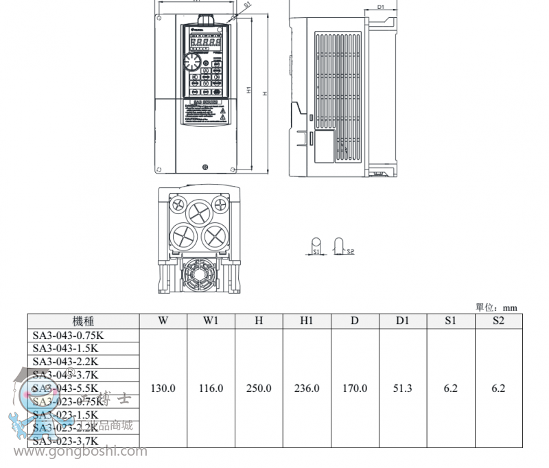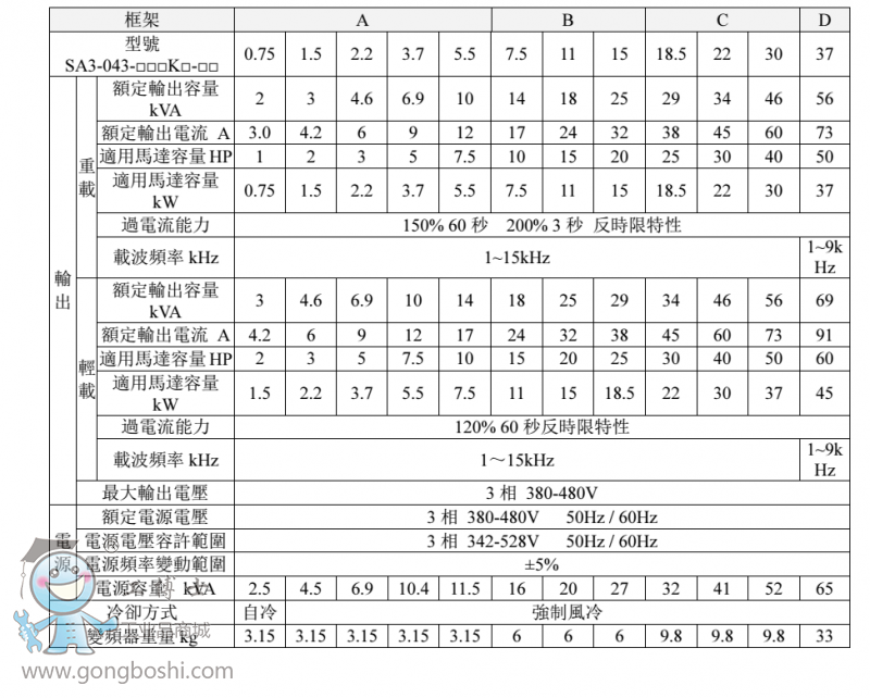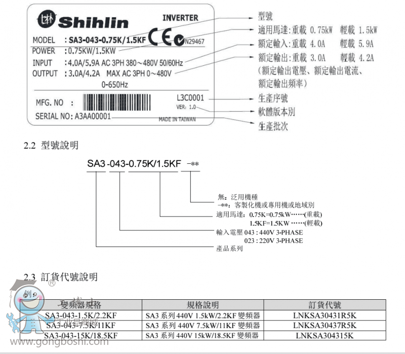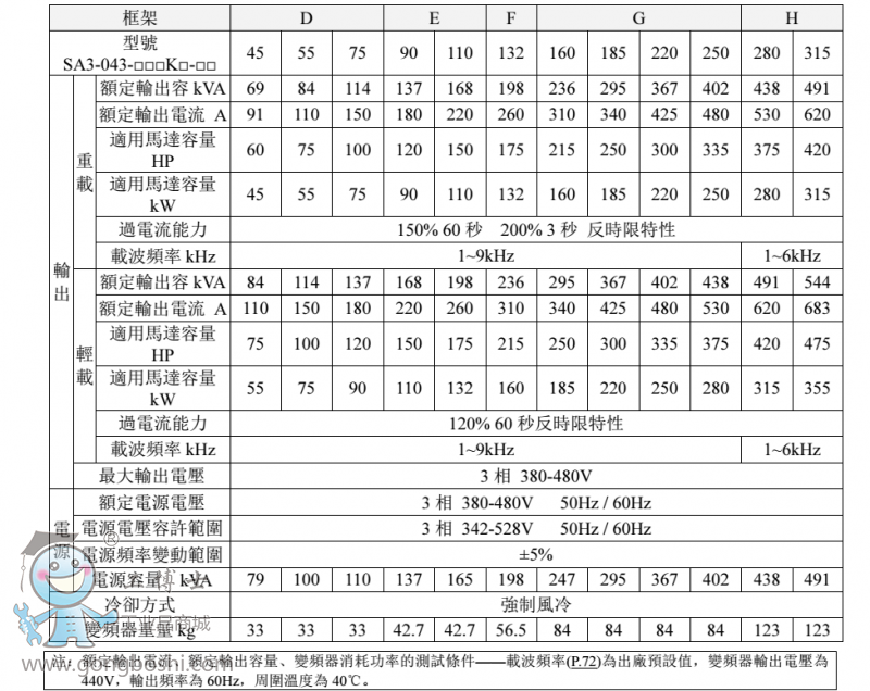 士林變頻器SA3-043-5.5K/7.5KF重載5.5KW 輕載7.5KW