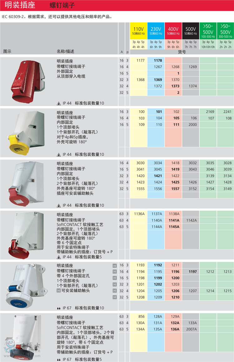 業用插頭、插座和電纜連接器,組合插座箱,照明配電箱、檢修電源箱、動力配電柜、冷藏箱插座屏等產品。