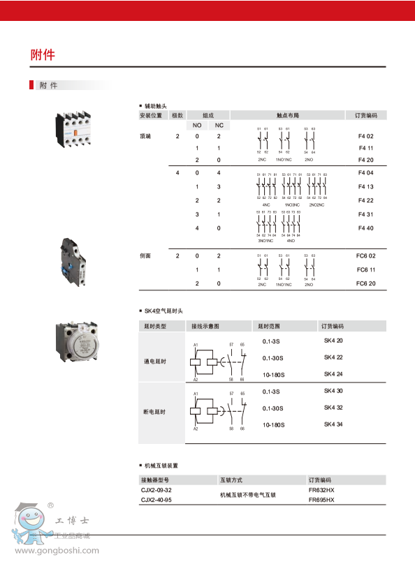 | 附件齊全,包括頂輔助觸頭、FC6側輔助觸頭、SK4空氣延時頭、FR6機械連鎖等附件,能實現更多擴展功能 |