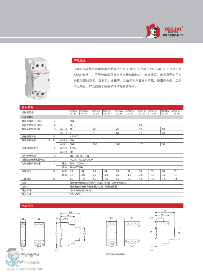 適用于交流50HZ,額定工作電壓至230V,使用類別AC-7a時,工作電流至25A,使用類別AC-7b時,工作電流至63A,額定限制短路電流不超過6KA的電路中,作遠距離接通和分斷電路之用。
