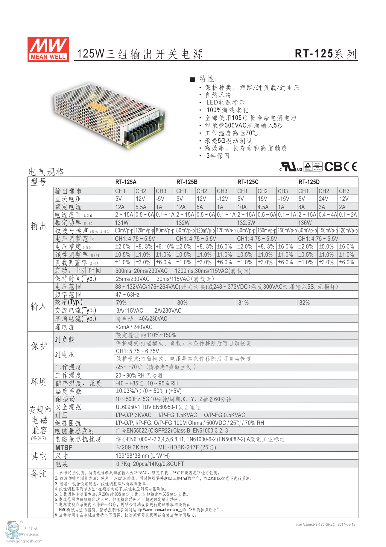 明緯RT-125A 125W三組輸出開關(guān)電源 G3系列