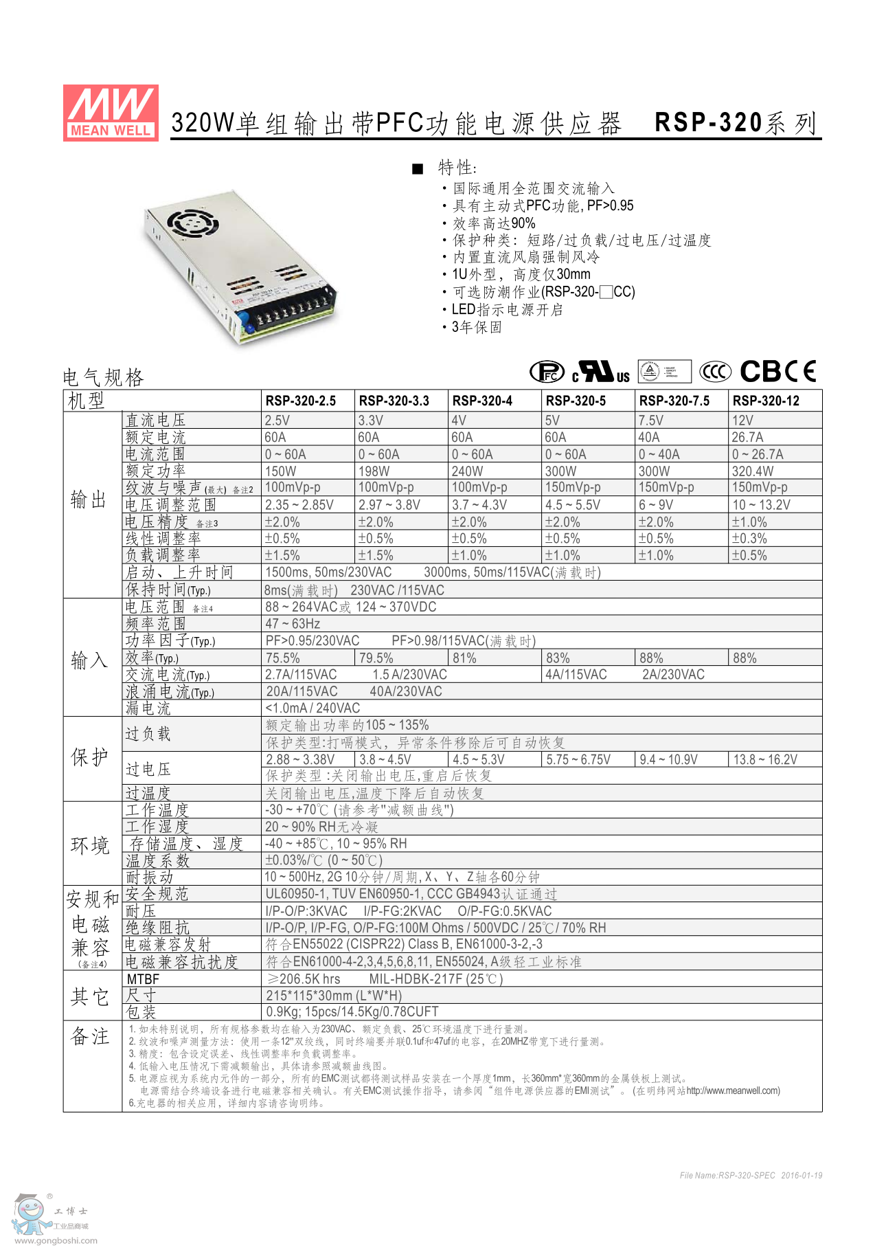 1U 低高度設計—75W~320W: 30 mm, 500W: 40.5 mm