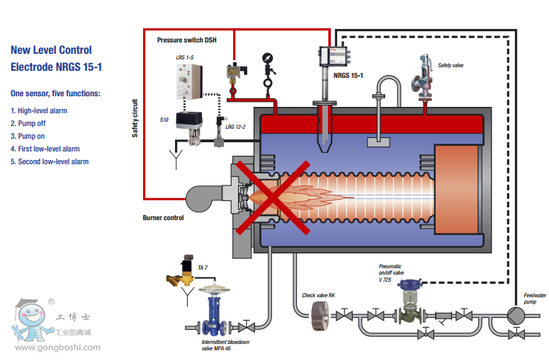 The NRGS Flowserve Gestra level probe with integrated switch points is dedicated to drive a feedwater pump in a tank. It provides up to four switching points: high water level, pump on, pump off, low water level.