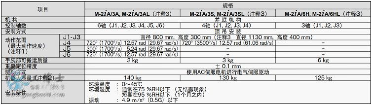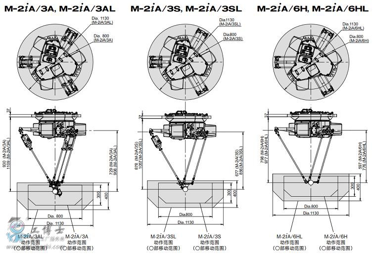 ●上述6種機(jī)型中,M-2iA/3AL, M-2iA/3SL以及M-2iA/6HL通過(guò)使用更長(zhǎng)的連桿,覆蓋了更廣的動(dòng)作范圍。