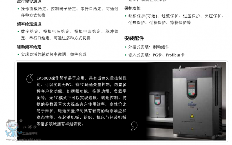 通用矢量控制變頻器 EV5000操作簡單易于應(yīng)用,具有出色矢量控制性能。 可以實現(xiàn)無PG、有PG磁通矢量控制,內(nèi)置多種客戶化 功能,如擺頻功能,抱閘功能、負載平衡等,無PG模式 下可以實現(xiàn)速度、轉(zhuǎn)矩控制。簡捷的參數(shù)設(shè)置大大提高 客戶使用效率,高性價比易于維護,磁通矢量控制具有 較高的動態(tài)響應(yīng)和穩(wěn)態(tài)性能。在起重機械、紡織、機床 與包裝機械等諸多領(lǐng)域擁有卓越表現(xiàn)。