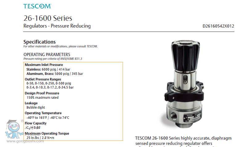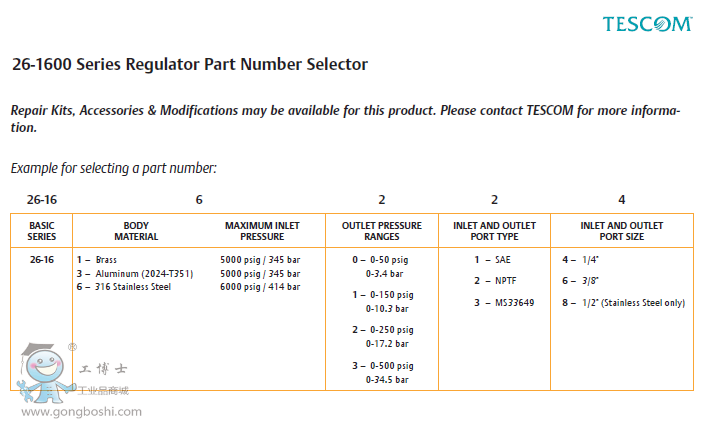 TESCOM 26-1600 Series highly accurate, diaphragm sensed pressure reducing regulator offers adjustable venting standard. Panel mounting, integrated 40 micron filter and low handknob torque ensure a robust and adaptable design with many modifications available.