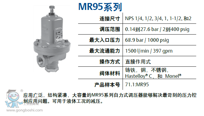 應(yīng)用廣泛,結(jié)構(gòu)緊湊,大容量的MR95系列自力式調(diào)壓器能夠解決*苛刻的壓力控制應(yīng)用問題。可用于液體工況的減壓。