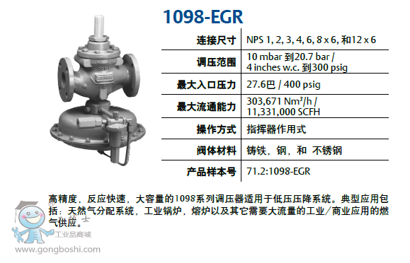 高精度,反應快速,大容量的1098系列調壓器適用于低壓壓降系統。典型應用包