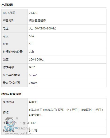 德國霸士BS24320明裝器具插座50V/63A/5P/IP67原裝現貨