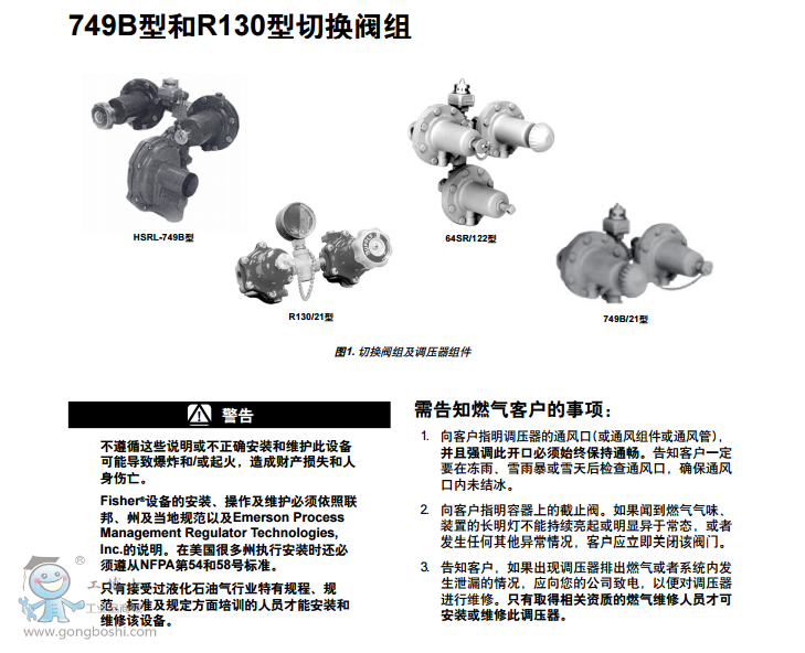 Fisher 的 749B 型調壓器是一種大流量轉換歧管,用于商業和工業應用。它由兩個 64 系列調壓器和一個 803 型直通指示器構成。