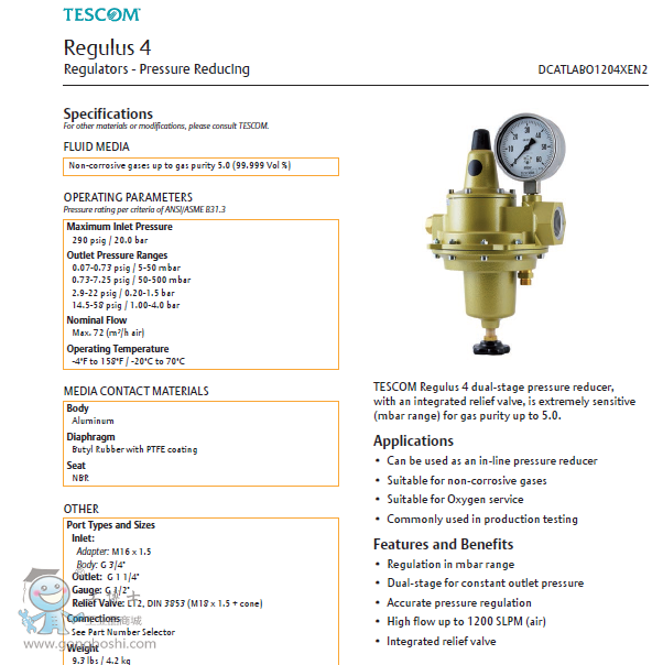 TESCOM Regulus 4 dual-stage pressure reducer, with an integrated relief valve, is extremely sensitive (mbar range) for gas purity up to 5.0.
