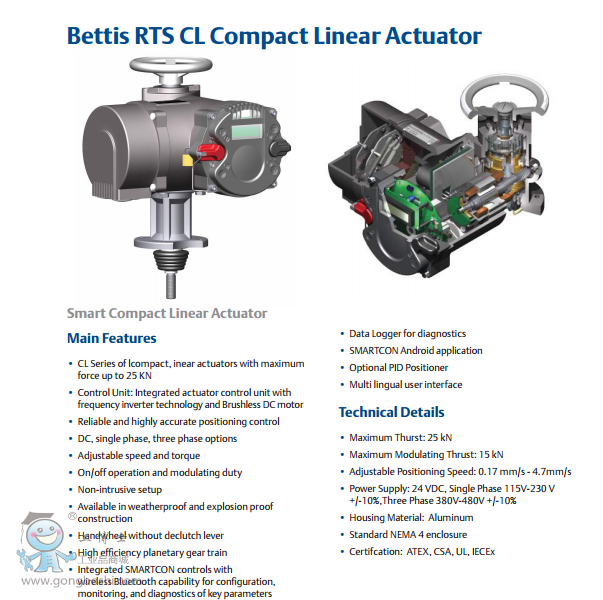 A non-intrusive, compact, linear, electric actuator with absolute position detection with configurable speed options. Robust and compact design that are widely used on valves for marine, oil and gas, chemical, power, and water and wastewater applications.