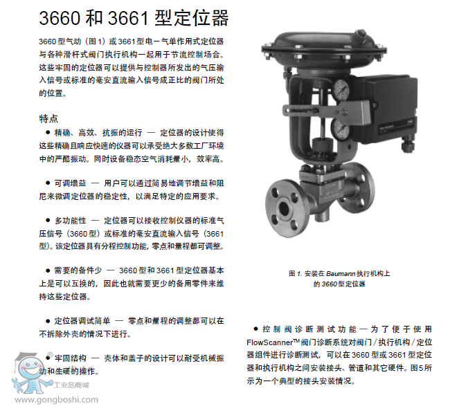 • 多功能—定位器可接受來自控制設(shè)備的標(biāo)準(zhǔn)氣動輸入信號 (3660) 或標(biāo)準(zhǔn)毫安直流輸入信號 (3661)。此定位器提供分程控制功能以及可調(diào)的零位和量程。
