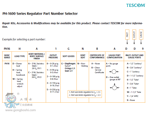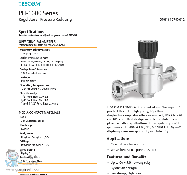 TESCOM PH-1600 Series is part of our Pharmpure™ product line. This high purity, high flow single-stage regulator offers a compact, USP Class VI and BPE compliant design suitable for biotech and pharmaceutical applications. This regulator provides gas flows up to 400 SCFM / 11,320 SLPM. Its Gylon® diaphragm ensures gas purity and integrity.
