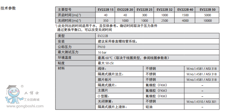 EV222B 是一款適用于污染型或腐蝕性介質(zhì)的間接先導(dǎo)式電磁閥系列。閥體材質(zhì)采用不銹鋼;通過(guò)隔離膜片防止雜質(zhì)侵入電磁閥系統(tǒng);內(nèi)置導(dǎo)控過(guò)濾器;閉合時(shí)間可調(diào)節(jié),防護(hù)等級(jí)*高為IP67。這些確保了工作的可靠性和滿意度。 2 位/2 通 先導(dǎo)式 隔離膜片 DN 15 - DN 50 不銹鋼閥體 僅有常閉型號(hào)