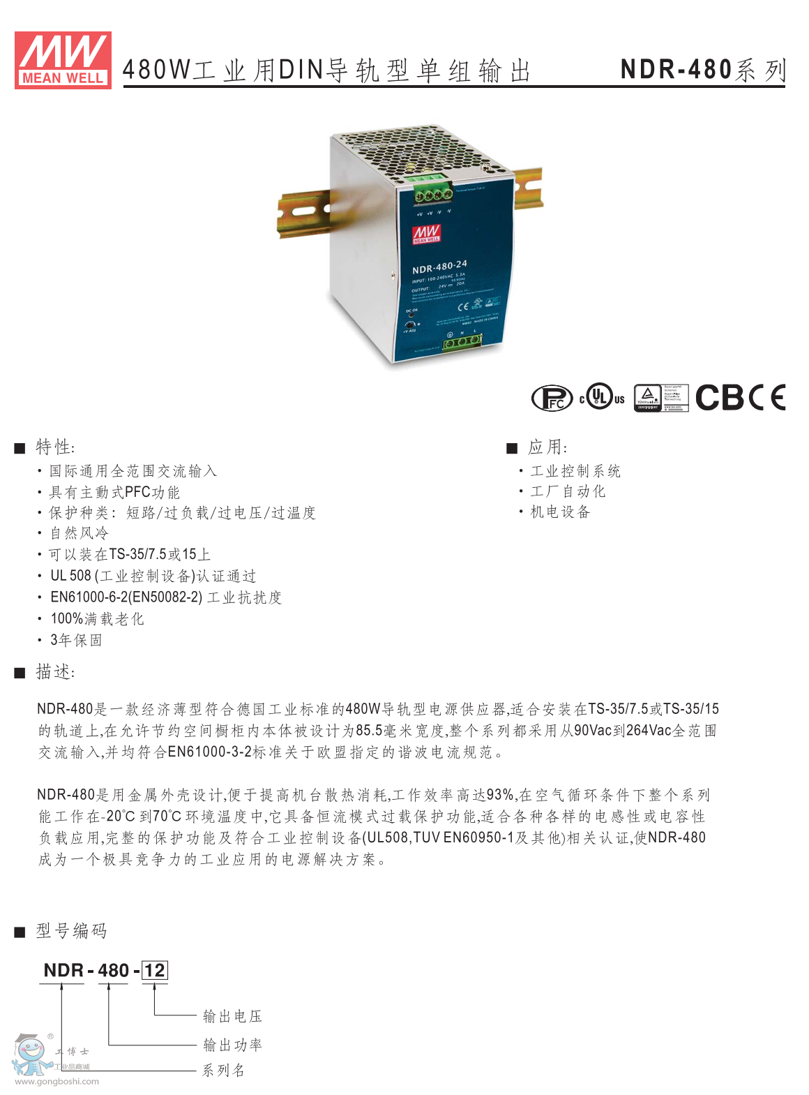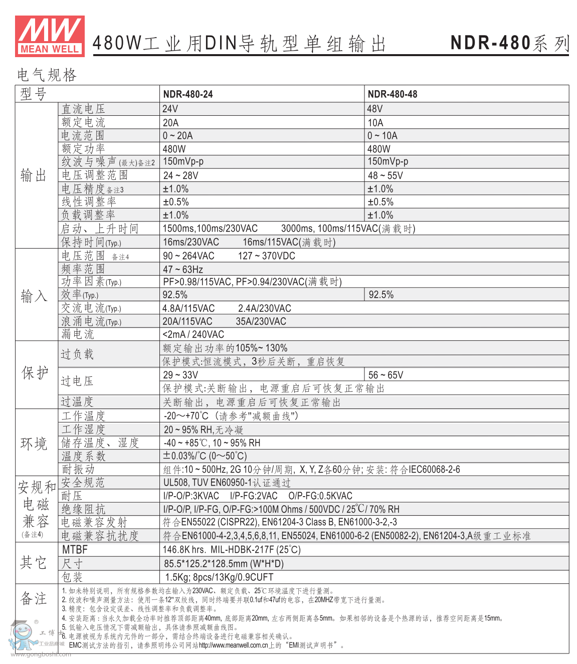 臺灣明緯導(dǎo)軌電源NDR-480-48 480W 48V 10A 3年保固