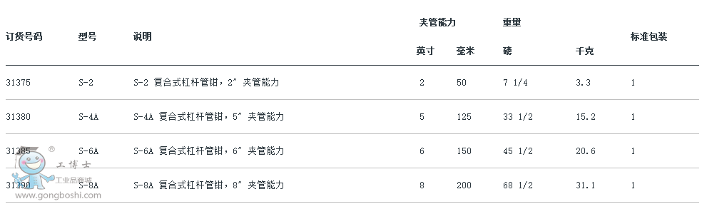 復合式杠桿管鉗采用獨特設計,可成倍增加扭力。非常適合松開因年久失修或損壞而卡死的聯軸器和接頭。可更換式鉗口采用硬化合金鋼材料。