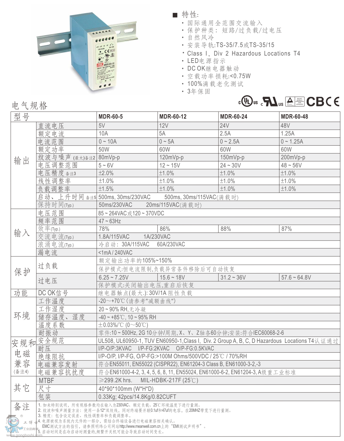 MEAN WELL/明緯MDR-60-24 24V2.5A導軌電源現貨供應